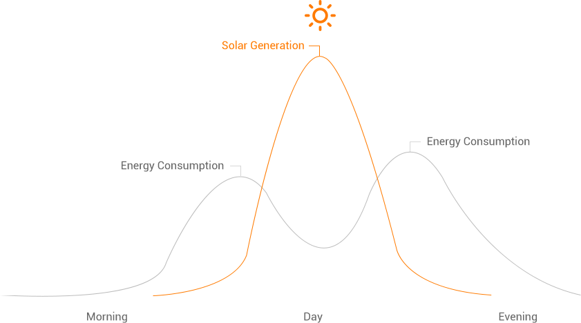 As shown in the curve, energy demand is large in the morning and evening, while solar radiation is strong at noon. With Battery Energy Storage System, power consumption and supply are well balanced.